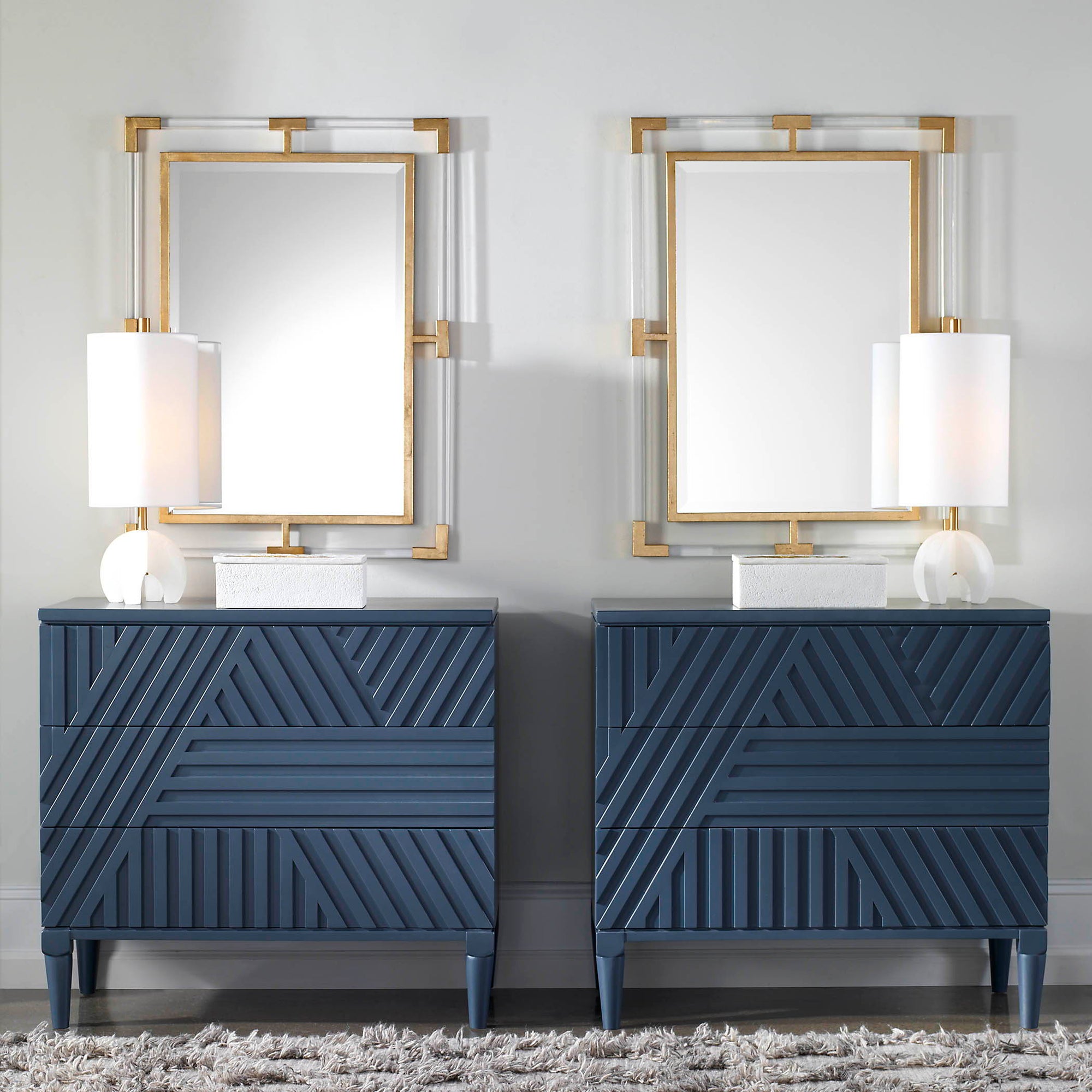 This Mirror Can Certainly Serve As A Focal Point For Any Room. Combining Forged Iron Finished In A Metallic Gold Leaf With Suspended, Clear Acrylic Solid Bars Creating A Modern Feel. Mirror Has A Generous 1 1/4" Bevel And May Be Hung Horizontal Or Vertical.