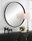 This Large Round Mirror Showcases A Strap Style Iron Frame Finished In A Sleek Matte Black With Soft Curved Ends That Encompass Antique Gold Column Medallions. The Floating Style Mirror Has A Generous 1 1/4" Bevel.