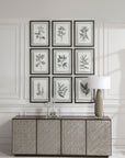 A More Modern Take On Classic Botanical Prints, This Set Of Artwork Showcases A Classic Black And White Theme With Deckled Edges. Each Print Is Placed Under Glass And Accented By A Petite Distressed Matte Black Finished Frame.