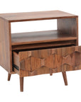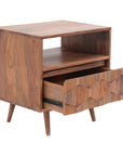 The O2 nightstand is a retro-inspired with a modern twist. Constructed with solid sheesham wood, this piece makes it resistant to major wear and tear. Its warm tone and intricate drawer front provides character and ample storage to your bedroom space.